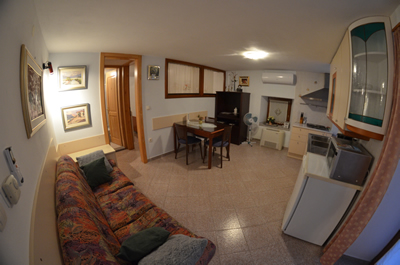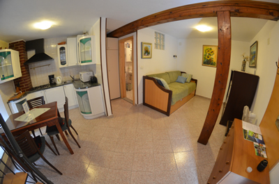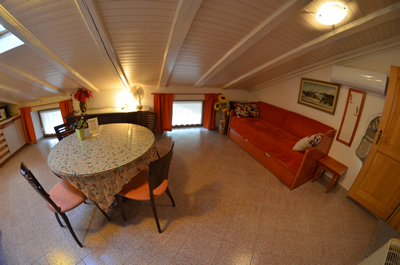 Posebnost tega apartmaja so okrogle stopnice, ki vodijo iz dnevnega prostora do treh ležišč. Eno ležišče ja v majhni sobi, drugi dve postelji pa v drugem prostoru. Ravno tako je tukaj kuhinja z jedilno mizo in kopalnica, Dva metra od vhodnih vrat je balkon s pogledom na atrij, ki ga lahko gostje mirno uporabljajo.